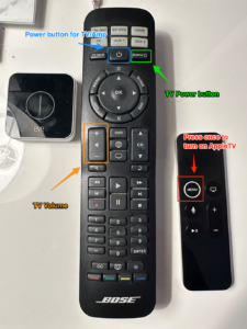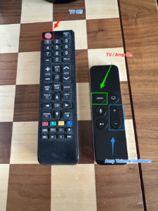 The living room TV is connected to an AppleTV; we do not have cable in the house. The AppleTV in both the living room and the bedrooms have several subscriptions for entertainment (Netflix, Hulu, Disney+, etc). The single AppleTV remote will turn on the TV/Amp via tapping the Menu button. The + / – buttons will control the volume of the amp. Use the Samsung remote and press the Power button to turn off the TV when done or just walk away and let the idle timeout turn them all off.